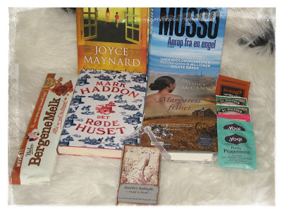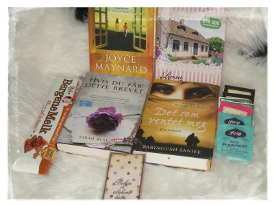 Dette må jeg jo være med på! Jeg må innrømme at det var spesielt sjokoladen som fristet da jeg er en ordentlig sjokoladespiser! Det er litt vanskelig å se hva bøkene heter på bildene men «Det røde huset» hadde et artig omslag! Om jeg vinner får du plukke resten av bøkene for meg du, så lenge de er romaner!