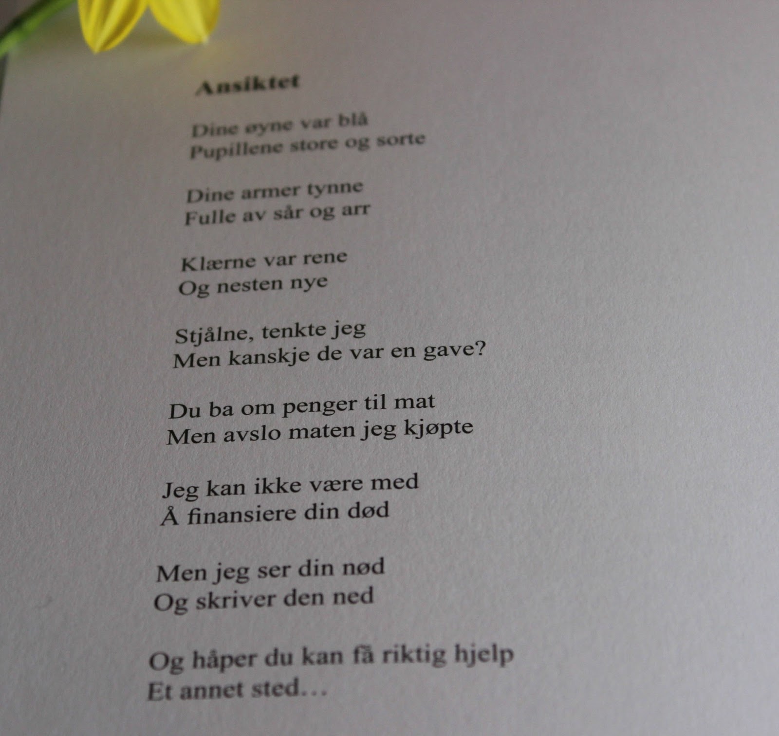 Jeg har lest et par dikt høyt for meg selv hver eneste kveld siden jeg fikk boken og jeg har kost meg veldig. Noen av diktene gjorde naturlig nok mer inntrykk enn andre igjen.Men det har jo med å gjøre hvilke erfaringer man har gjort seg hittil i livet.