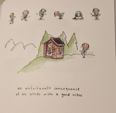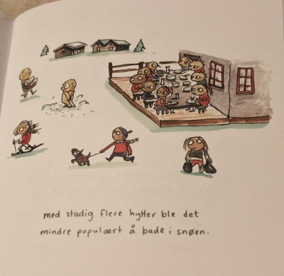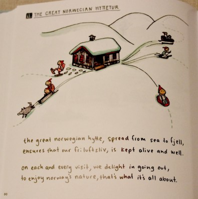Som dere ser så er boken full av fine og morsomme illustrasjoner om det norsk hytteliv og har dere noen i familien som har hytte eller har tenkt å skaffe seg en, så har dere et fint tips her til julegave! Teksten i boken er en blanding av engelsk og norsk og jeg likte den vrien. Det var også en del å kjenne seg igjen i og jeg flirte godt underveis, en artig bok som jeg koste med med. Jeg er glad jeg ikke valgte å gi boken vekk likevel.