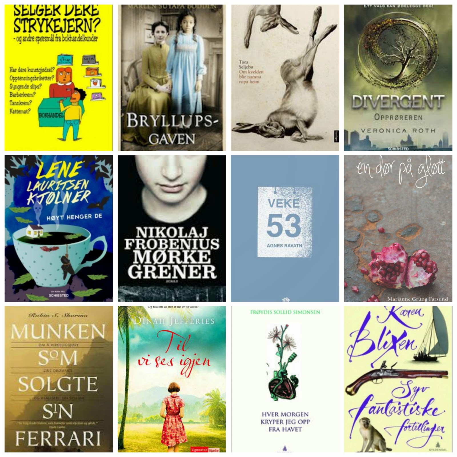 Av de 12 bøkene jeg har lest denne måneden så kan 4 av dem som nomineres til BBP- 2014 og er derfor å finne under fanen Bokbloggerprisen 2014. Disse er En dør på gløtt, Selger dere strykejern?og andre spørsmål fra bokhandelkunder, Om kvelden blir namna ropa heim og Høyt henger de.