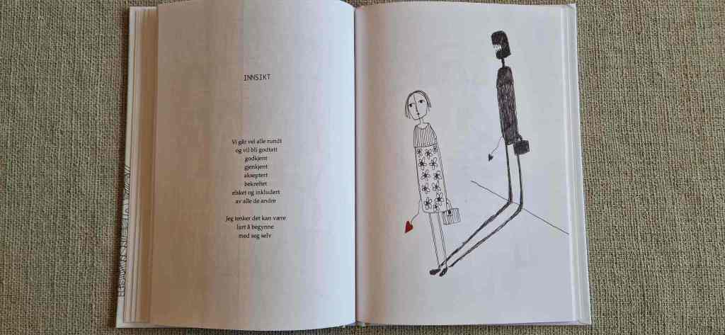 I fjor sommer leste jeg forfatterens debutbok Hjerteriss, som var en perfekt gavebok jeg likte veldig godt. Årets utgivelse er laget etter samme oppskrift som den forrige med ord og tilhørende illustrasjoner som utfyller hverandre på en veldig fin måte. Hovedtema for årets bok er andres forventninger og egen selvfølelse i overgangen fra voksen til litt mer voksen.
